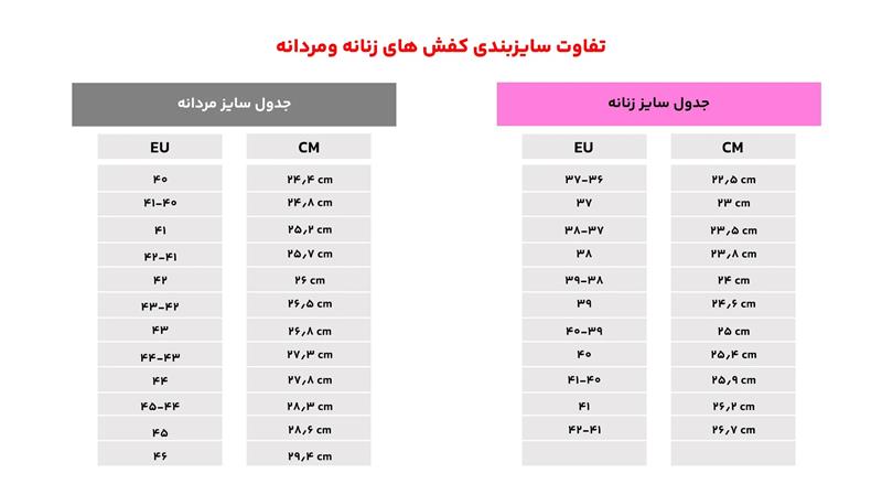 برای انتخاب صحیح سایز کفش با استفاده از جدول زیر سایز مدنظر خود را انتخاب کنید.